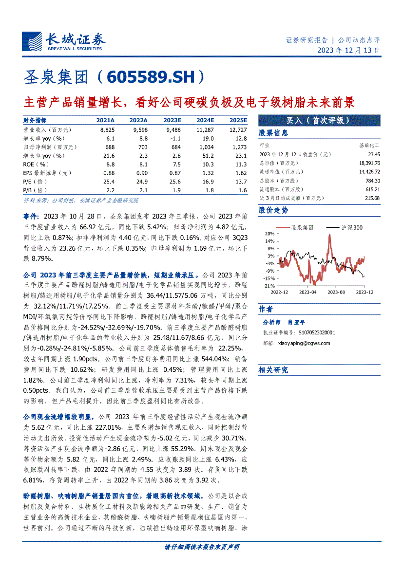 公司通过不断的科技创新,陆续推出铸造用环保型呋喃树脂、涂买入(首次评级) 股票信息 行业基础化工2023年12月12日收盘价(元) 23.45 总市值(百万元) 18,391.76 流通市值(百万元) 14,426.72 总股本(百万股) 784.30 流通股本(百万股) 615.21 近3月日均成交额(百万元) 215.68 股价走势作者 分析师 肖亚平执业证书编号:S01 邮箱: 相关研究-21% -15% -9% -3% 3% 8% 14% 20% -04-12圣泉集团沪深300公司动态点评P.2料、保温冒口等铸造辅助材料,各类环保型、耐热及增韧改性高性能酚醛树脂、印制电路板及光刻胶用电子级酚醛树脂、电子级环氧树脂以及航空航天用高强度酚醛预浸料、高强低密度酚醛SMC、阻燃增强轻质酚醛轻芯钢、改性阻燃酚醛泡沫等产品,下游应用领域逐步拓展到汽车、风电、核电等机械制造领域,以及集成电路、液晶显示器、航天航空、建筑节能、高端刹车片、冶金耐火、3D打印等国民经济各个领域。