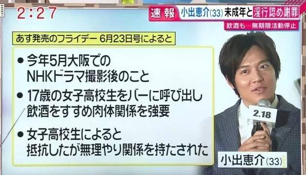 原本9日某周刊预定刊登小出惠介和未成年少女饮酒的报导,他在被爆料之前决定自曝。据悉,他5月在大阪拍完电视剧之后,和一名17岁女高中生相约到酒吧喝酒,随后强行要跟对方发生性关系,女方受访时透露,虽然奋力抵抗了,但还是无法阻止被硬上。